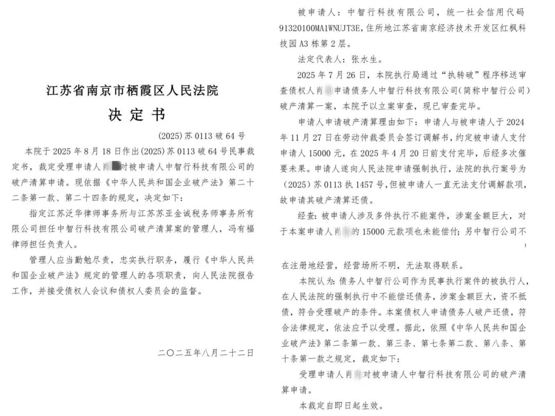 2025年9月,中智行最终因无力偿付一笔1.5万元的劳动仲裁款项,被法院正式裁定破产清算。这笔看似微不足道的债务,成为压垮这家公司的最后一根稻草。